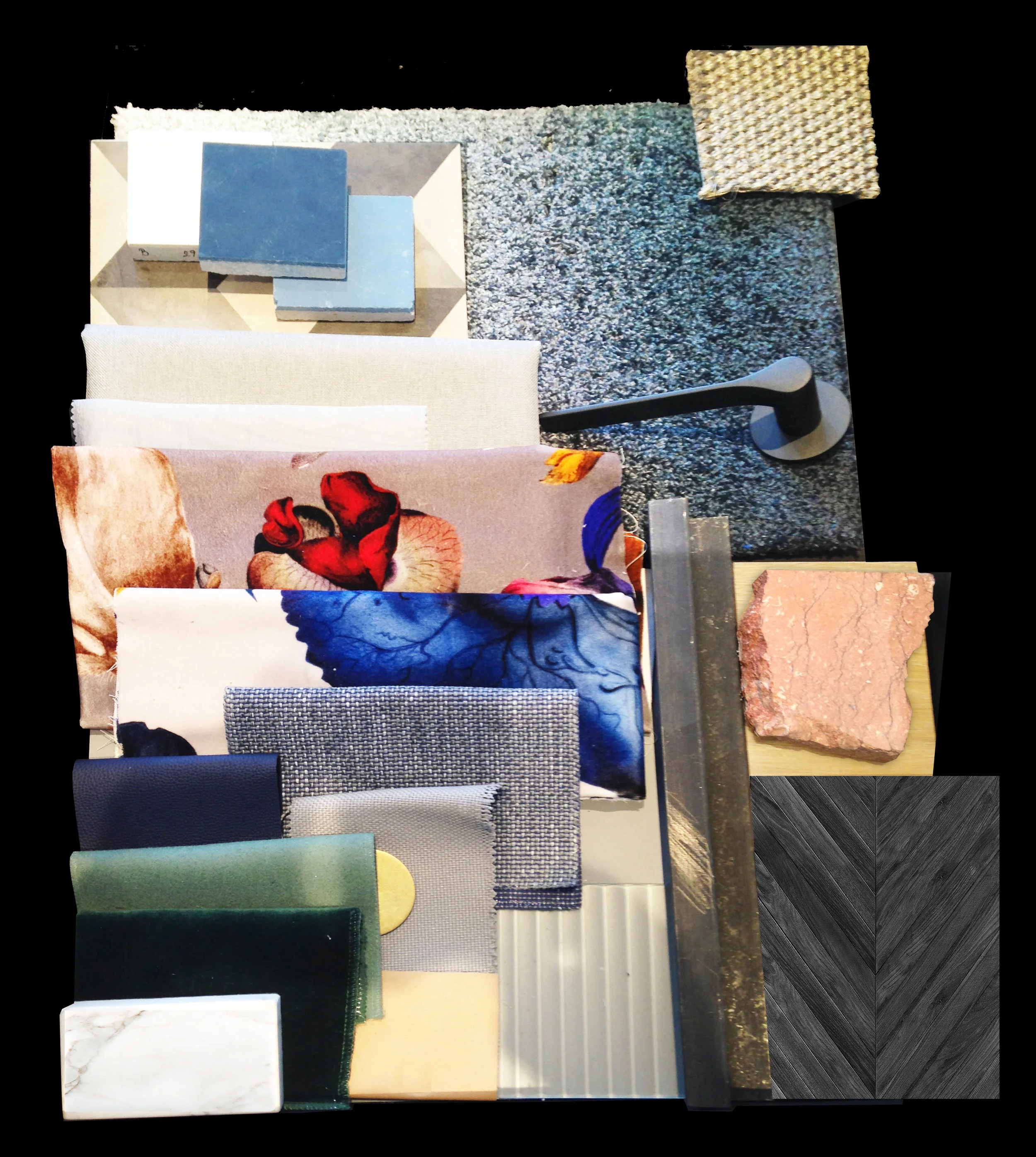 Collaborating with Kit Miles, we ensured his cobalt blue fabric (Biophillia printed graphic) on cotton velvet ground would be suitable for the hospitality market with rubs high enough to upholster a Gubi Beetle lounge chair for the bedrooms. To add variation, we included a light and a dark scheme.